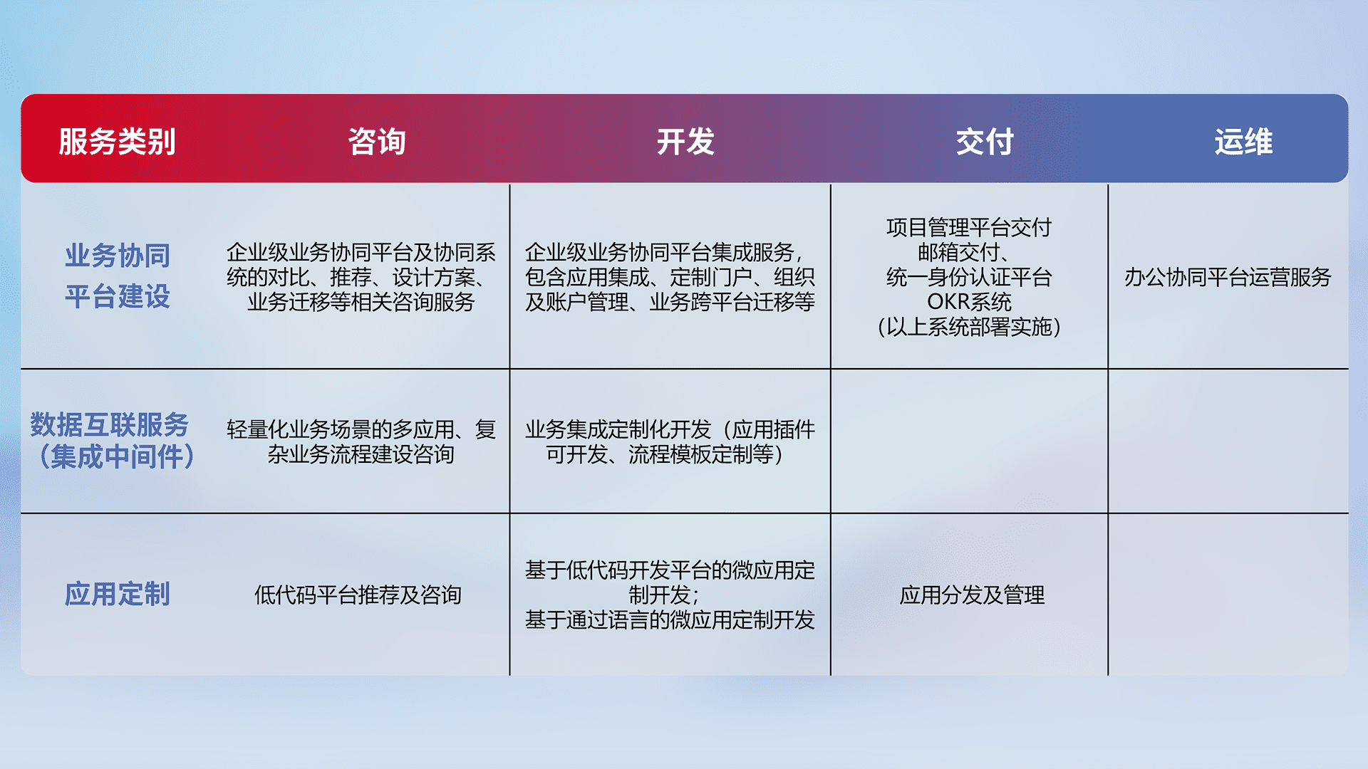针对钉钉、、、企微、、IDaas等平台级产品提供产品的规划、、、、方案、、、、交付、、定制化开发等服务,,,,实现如统一协同办公、、智能客户服务、、、、混合会议管理、、、智能数据查询、、、、等业务场景,,,实现数字化转型。。