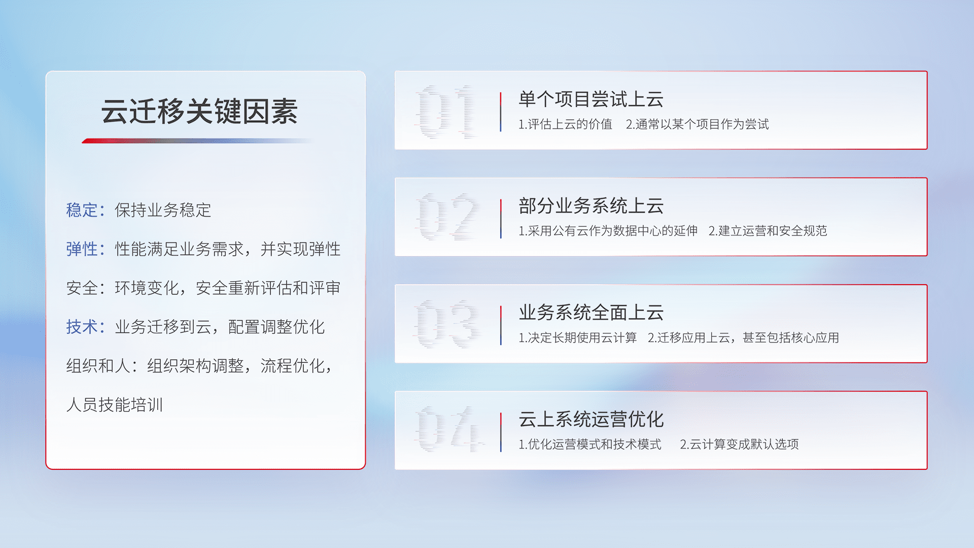 结合实际业务,,,,从规划设计、、、、云平台选型、、、云原生改造、、、数据迁移、、集成交付,,,,迁移全过程为客户识别最佳上云路径,,,,做好风险识别管理,,,设计网络架构、、身份权限、、安全审计合规、、操作审计、、日志审计、、监控告警策略、、、多站点容灾设计等,,,对云上基础设施进行整体规划,,,提升IT治理水平,,以满足弹性、、、、高可用、、、高性能的需求。。